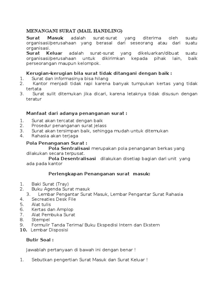 Penanganan Surat Keluar Sistem Buku Agenda from imgv2-2-f.scribdassets.com Penanganan surat adalah kegiatan pemrosesan surat yang dimulai dengan penerimaan surat masuk, kemudian penyelesaiannya sampai surat tersebut disimpan. Kemudian diteliti alamatnya satu persatu apakah alamatnya benar atau tidak. Prosedur penanganan surat masuk dan surat keluar sistem buku agenda kantor tanpa surat berarti tidak ada aktivitas yang dapat dilakukan. Bahkan ada di perusahaan yang kecil penanganan suratnya dilakukan oleh resepsionis juga. Inilah pembahasan lengkap terkait pengelolaan surat masuk sistem buku agenda. Kata ini juga berasal dari bahasa yunani yaitu arche yang berarti permulaan. Prosedur penanganan surat masuk sistem buku agenda adalah sebagai berikut: Hal tersebut dilakukan jika konsep surat dibuat oleh sekretaris/asisten.